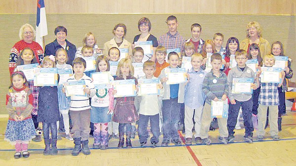 Kootenai Valley Christian School students receiving Terrific Kids certifications include, from front left, Hannah Wolfe, Kayla Hoff, Jace DeShazer, Savanah Lucas, Katelyn Schmitt, Jayden Bower, Izack Howe, Thomas Roark, Tyler Andersen, Landyn Kendall, Steven Hilliard. In the middle row, from left, are Anna Marie Kebschull, Hannah Schertel, Hunter Bower, Nick Stoick, James Warner, Carlos DeAlvardo, Emily Walters, Aleah Ford, Skye Anderson, Bethany Thomas, Yeshara Robertson. In the back row, from left, are Kiwanis members, Pam Peppinger and Kate Huntsberger, Laurynn Lauer, Kenzie Wolfe, McKenzie Cosgriff, Niklaus Neumann and Kiwanis President Donna Hall.