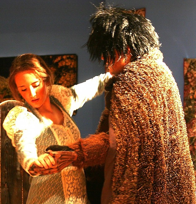 Beauty (Sam Garrison) teaches Beast (Chris Halling) how to dance.
