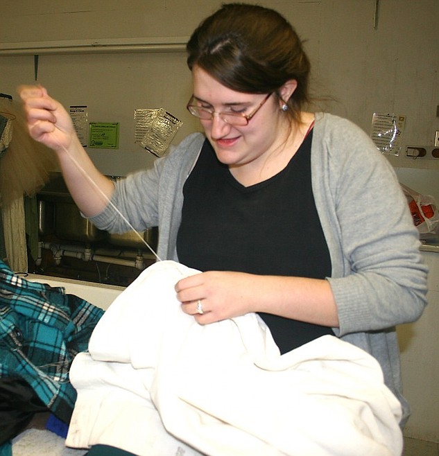 Kendall Knight sews a pocket into Beauty's cape backstage prior to the Plains High School production of "Beauty and the Beast" Friday night. Knight played Aunt Sweet.