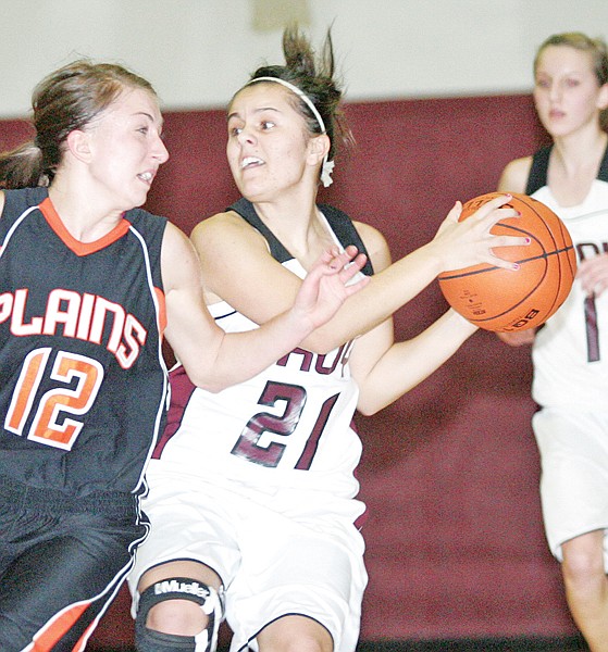 The Plains defense was tough Friday night as Alanah True-Silva looks for a way around Kelsey Beagley in second quarter action.