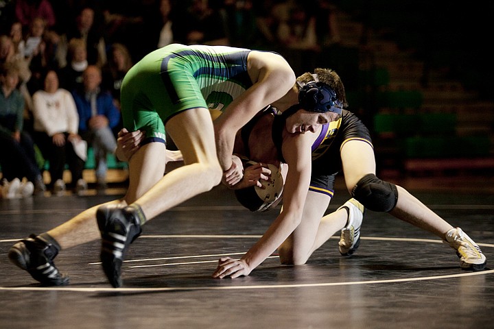 Kaleb Mitchell, left, tries to take down Missoula Sentinel's Jordan Hegel during Glacier's home dual against the Spartans Tuesday night.