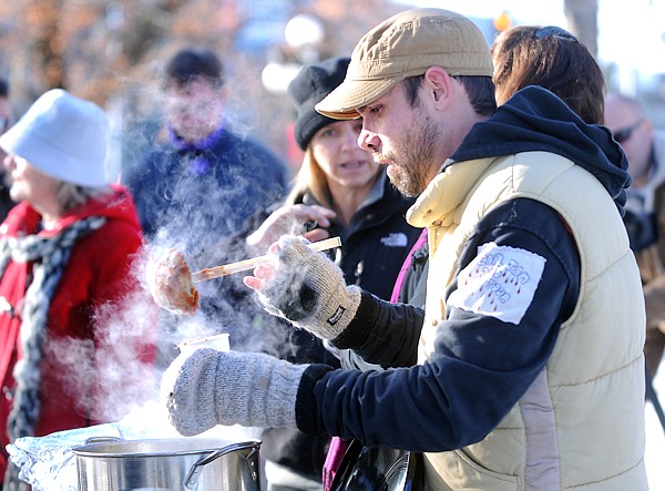 Curt Lamm of Lakeside, assistant director of Samaritan House, serves a cup of chili as the crowd begins to gather at the start of the Homeless Persons’ Memorial Day ceremony on Wednesday afternoon at Depot Park in Kalispell.
