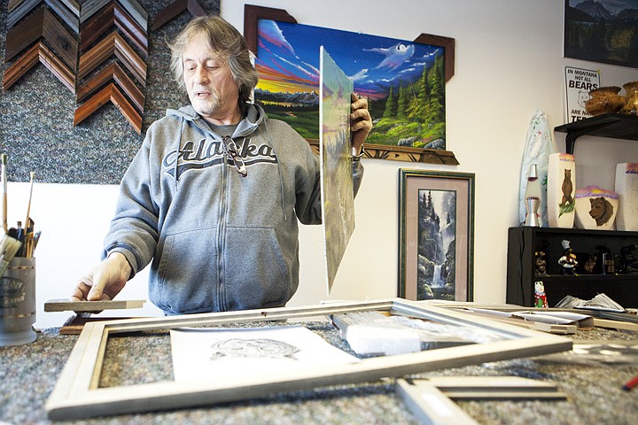 Wayne Mosbarger frames one of his paintings at the Smoke Haus Emporium in Evergreen Wednesday morning.