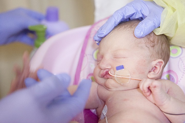 Amber Thornton and Don Lessor wash their baby daughter Alexis in the Neonatal Intensive Care Unit at Kalispell Regional Medical Center Wednesday morning Oct. 19, 2011. Alexis was born with a cleft palate.