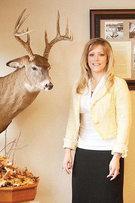 Karin Holder stands near a mounted whitetail deer on display at her office in Whitefish. The mount is made from the antlers of a deer Holder's father shot and the cape is from a deer she took.