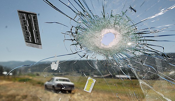 A bullet hole is shown in the windshield of a Flathead County Sheriff’s Deputy Roger Schiff’s patrol vehicle in August 2011.
