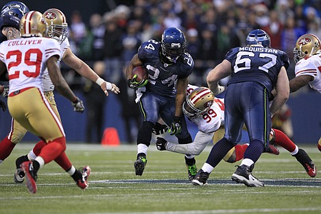 The Seahawks became the first team this season to score a touchdown rushing on the 49ers defense when Marshawn Lynch scooted around the left end and scored on a 4-yard run with 6:41 remaining that gave Seattle a 17-16 lead.