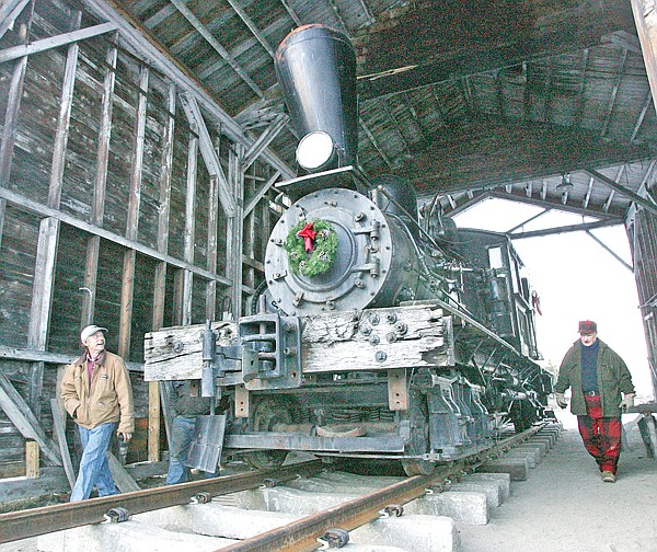 Once inside, Lloyd Holcomb, left, takes one last look and smiles as he passes the old Shay while Doug Adams checks the track.