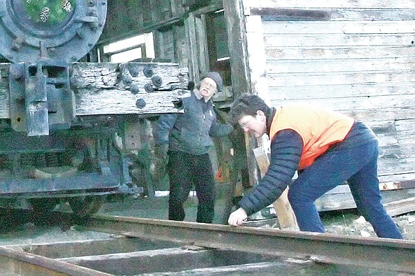 Sheila Etienne retrieves a penny she placed on the track as Ron Carter guides the Shay the last few inches into the engine house.