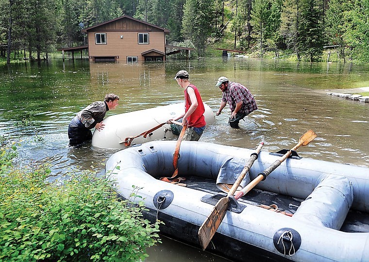 Ryan Beavers, left, helps Bill Pataky of Northern Energy Propane, right, maneuver his propane tank safely away from the house in June near Creston. The Beavers' home in the background is partially submerged due to high water.