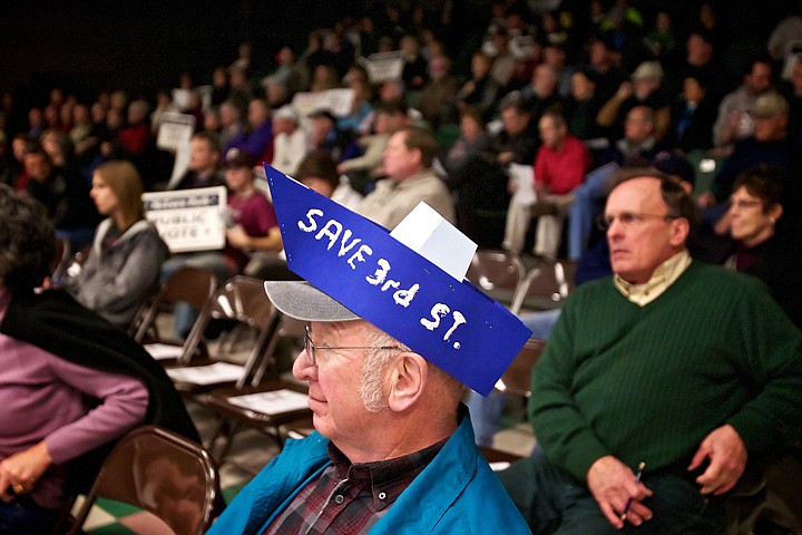Some people wore boat-shaped hats in support of keeping the Third Street boat launch. Others wore buttons. A petition against taking out the boat launch was circulated to collect signatures to hand over to the City Council in the future. Before the meeting, several people held signs asking for a public vote on the plan's eventual fate at the front door, and held those signs in the crowd.