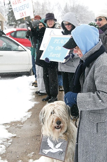 People driving by the intersection, which features a four-way stop, on Monday, seemed to take to the message. Most passers-by waved, honked or flashed a peace sign to the group of nine (and “official” peace dog Sophie) that held signs and messages promoting a lifestyle of peace.