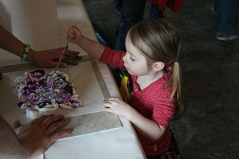 Over at the painting station, 3-year-old Adah Hadden swirled her brush on a white sheet of paper, mixing purples, whites and greens.
