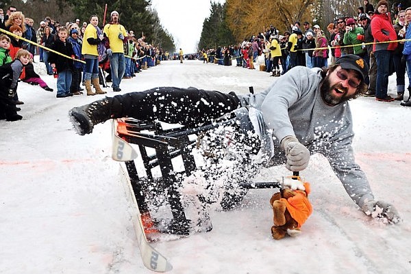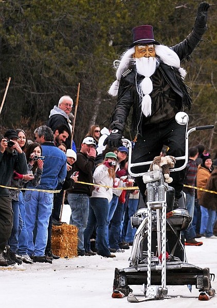 Doug Burnett of Bigfork donned a Sasquatch costume as he and his two grandchildren sat in a canoe fitted over electric conduit that allowed it to slide across the snow.