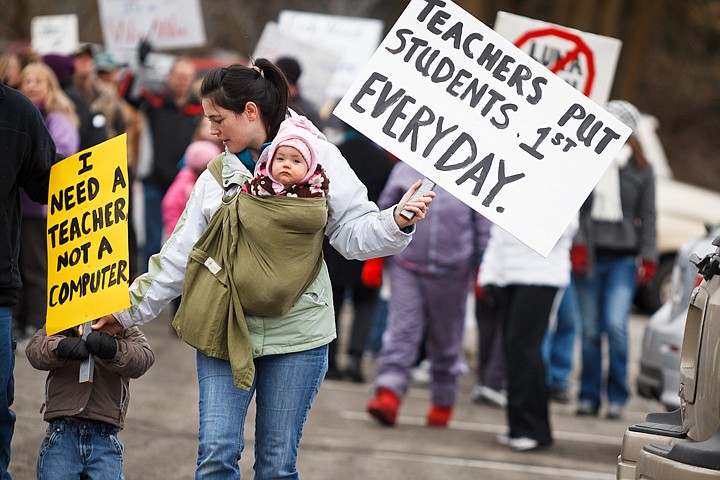 Teachers, parents and students voiced their opposition to Idaho public school chief Tom Luna's Students Come First legislation on Monday in downtown Coeur d'Alene during a Presidents Day rally promoted by the Idaho Education Association, the state's teachers union.