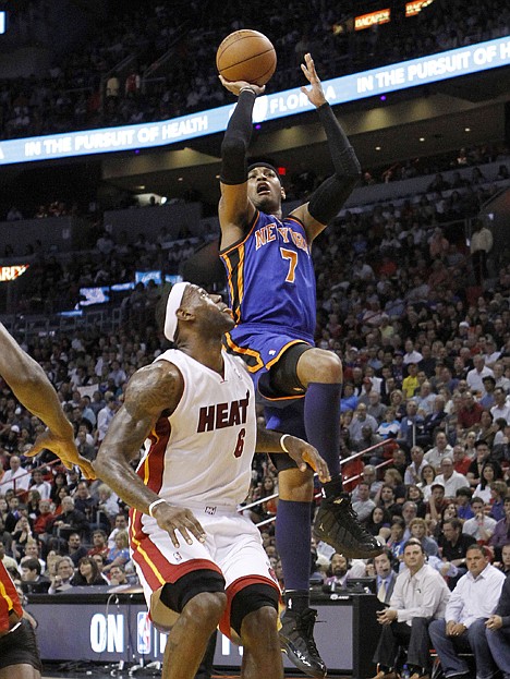 Carmelo Anthony scored 29 points, Amare Stoudemire added 16 points and a huge blocked shot against LeBron James with 7 seconds left, and the visiting New York Knicks stunned the Miami Heat 91-86 on Sunday night.