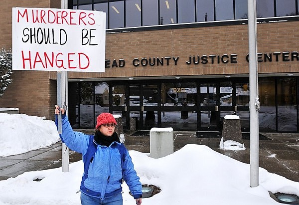 Outside the Flathead County Justice Center, two women stood along South Main Street holding signs with messages that included “murderers should be hanged” and “fight against domestic violence.”