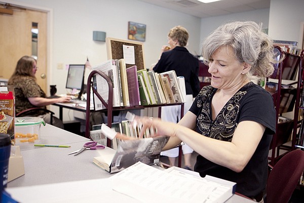 Dana Sampey applies property stickers to books that will stay in the new Whitefish Community Library on Wednesday afternoon.