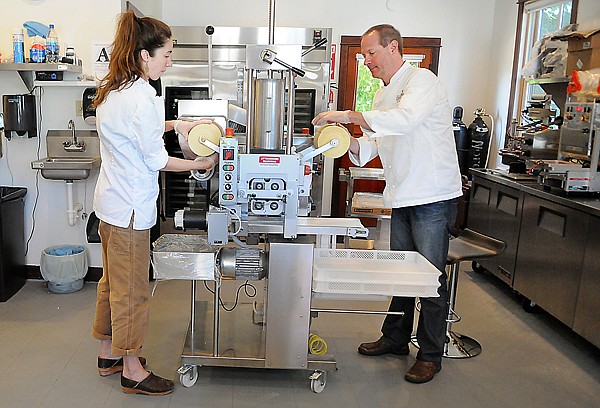 Meghan Holder and Jeff Russell work in tandem making goat cheese ravioli on Thursday afternoon at the Great Northern Pasta Company in Whitefish.