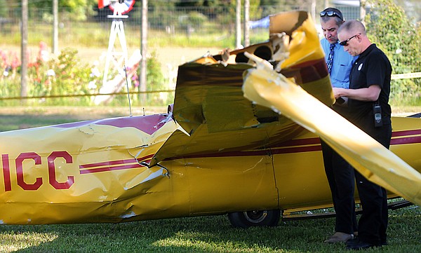 Sheriff Chuck Curry and Undersheriff Jordan White stand next to a glider that crashed Friday evening just south of the Ferndale Airfield. A man in his 60s was pronounced dead at the scene while another man of about the same age was airlifted for treatment, Curry said.