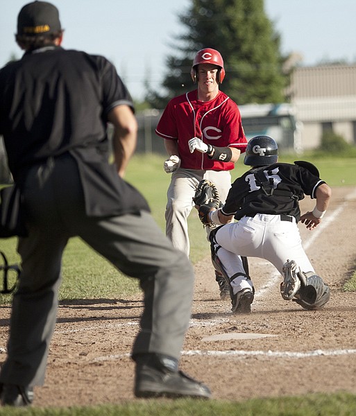 Glacier Twins catcher Jim Jumper tags out a Spokane Cannons runner who tagged up after a fly ball to left field in the top of the second inning at Memorial Park Friday night.