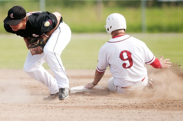 Michael O'Connell slides into second base on a steal early in the bottom of the second inning against the Lethbridge Elks at Griffin Field on Monday.