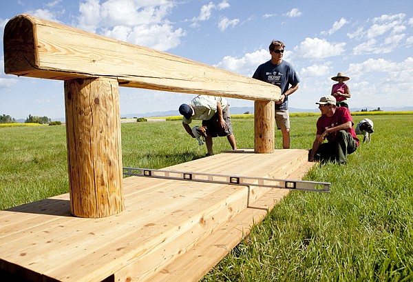(From left) Tommy Nenman, Bert Wood and John Kelly adjust one of the horse jumps as they set up for The Event at Rebecca Farm. Chris Wood (behind) plans to decorate the course after the jumps are set up.