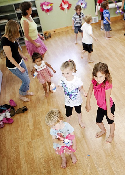 Students of Woodland Montessori School dance along as they watch a salsa dancing video Tuesday morning.