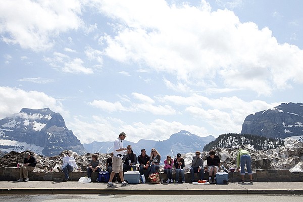 Vistors at the Logan Pass Visitor Center take a break to eat some food Wednesday morning as they enjoy the privilege of being among the first to make it to the top of the Sun Road for the year.