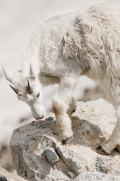 A mountain goat picks through rocks in search of food near Logan Pass along the Going-to-the-Sun Road in Glacier National Park Wednesday afternoon.