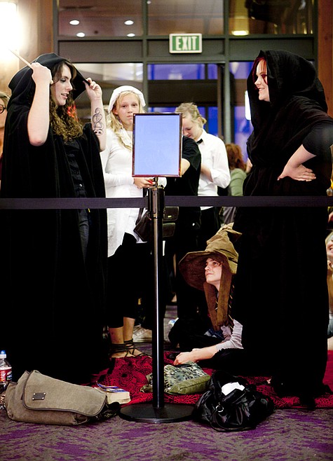 Stephanie LeFeuvre (left) and Kay Gardner dress as Death Eaters for the premier of "Harry Potter and the Deathly Hallows, Part 2." LeFeuvre and Gardner arrived at 3:30 Thursday afternoon to secure the first position in line for the midnight showing at Signature Theatres.