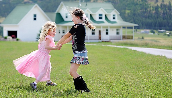 Rachel Wilmot, 4, left, and her sister Amber, 8, play outside their house on Thursday afternoon, west of Kalispell.