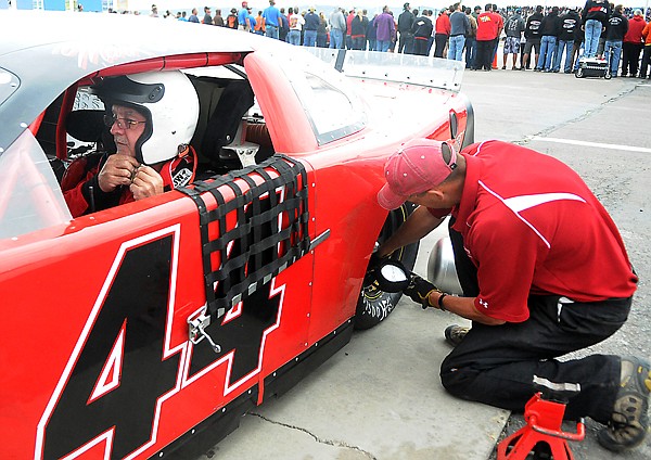 Mark Owens puts on his gear as crew member Jerry Norby checks the tires as they prepare to run a few practice laps before the start of the Montana 200 on Saturday evening in Kalispell. Results of the race were not available at press time.