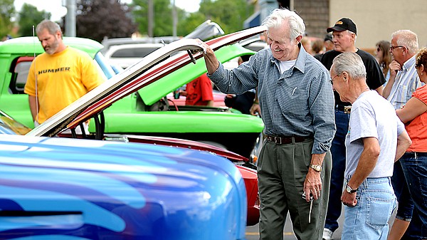 From left, Tom Needham, of Bigfork, smiles as he shows off his 1965 to Shorty Amera of Lethbridge, Alberta, on Friday evening at the Glacier Rally in the Rockies show and shine in Kalispell.