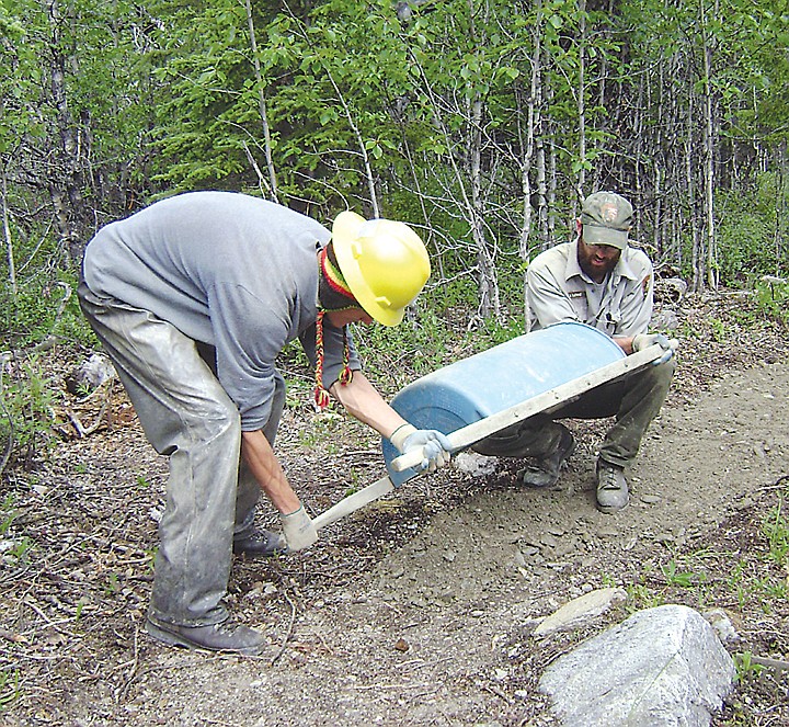 Talbot's crew used hand tools to carve a trail out of tundra - sheets of dirt, moss and other vegetation anywhere from a centimeter to a foot thick - before grading it with gravel from a dry stream-bed. They were originally tasked with finishing a 750 foot, 22-inch wide section of trail, but succeeded in carving out a 1,000 foot path 36 inches wide, despite being three crew members short for a couple of weeks due to injury.