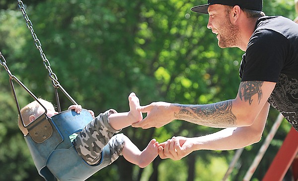 Robert Walker of Dutch Harbor, Alaska, plays with his one-year-old son Riley on Monday afternoon at Woodland Park. The family is in Kalispell visiting family over the summer break.