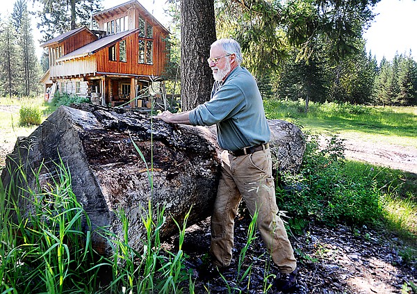 Lee Secrest removes bark from a log at his home north of Polebridge on Thursday. In the background is Secrest’s studio that he describes as “hippie house” style — something that has been added to over the years.
