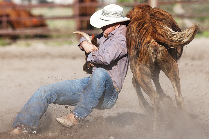Jake Andrews of Kalispell attempts to take down a steer during the NRA Rodeo at the Blue Moon Arena Friday night.