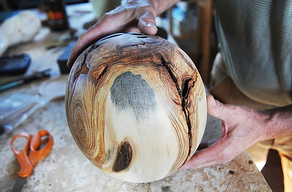 Secrest handles his newest sphere, a piece of juniper wood that had been struck by lightning. “If you can see something beautiful, it can make it a little easier to get through the day,” Secrest says. “That’s what art is supposed to do. It helps you on your journey.”