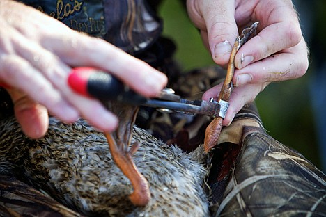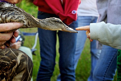 Eight kids and a few parents helped Idaho Fish and Game wildlife technician Aaron McKarley put lightweight aluminum tags on ducks that were captured, and then set them free.