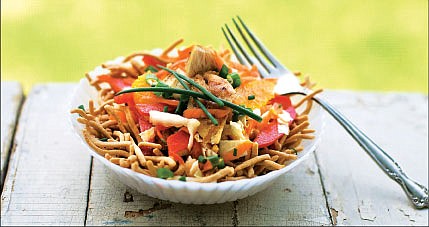 Of course, the salad wouldn't be right without crunchy chow mein noodles on top. When you buy them, choose carefully as some are fried and have considerably more fat and calories than baked varieties.
