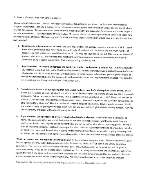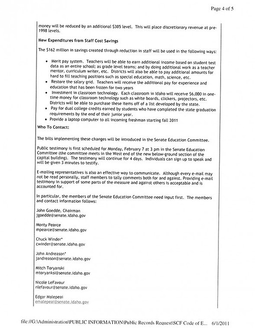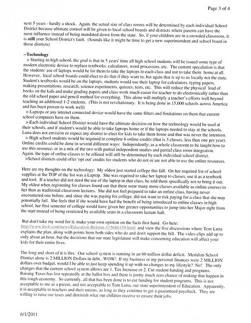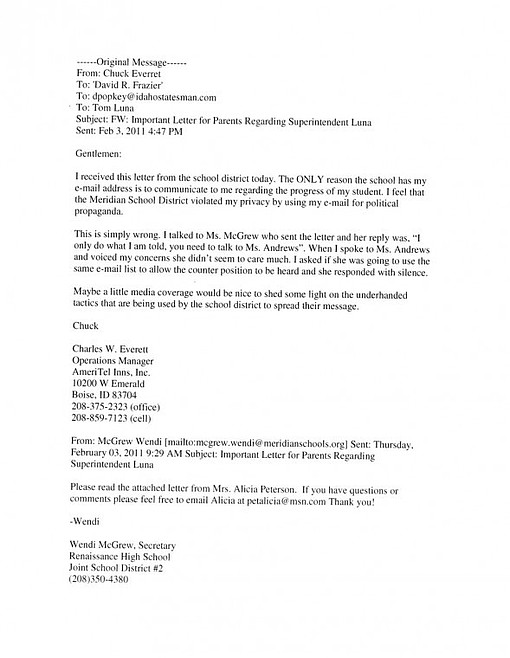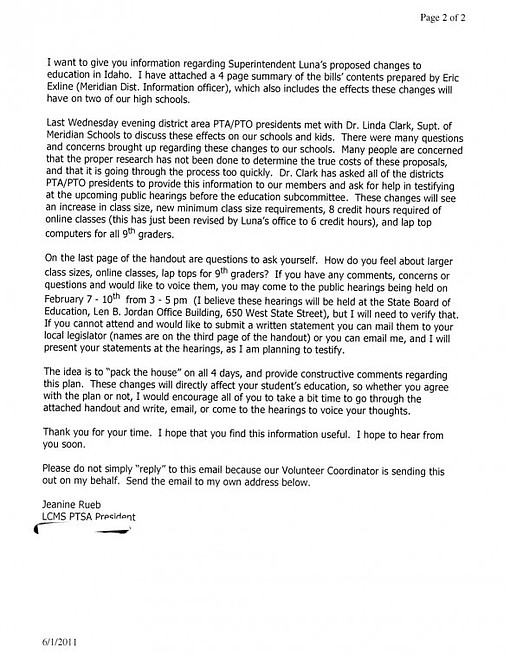 Please let me know if you need anything else. The full memo that Superintendent Luna sent on May 13 is posted online at http://educationidaho.blogspot.com/2011/05/sde-sends-memo-to-schools-regarding.html.