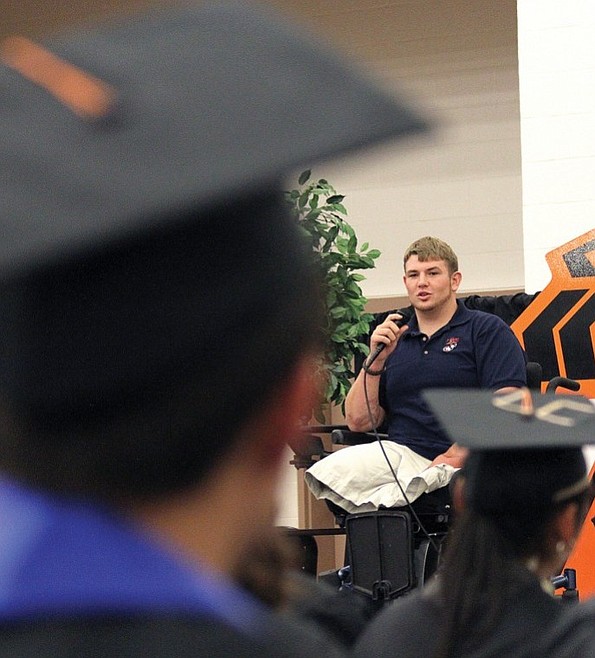 Ronan High School Principal Tom Stack proudly presented his former student, guest speaker Marine Lance Cpl. Tomy Parker, to wild applause.