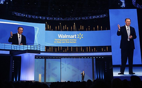 At a packed basketball arena at the University of Arkansas, CEO Mike Duke said Wal-Mart would add sales wherever it can: overseas, online, and in small towns and big cities.