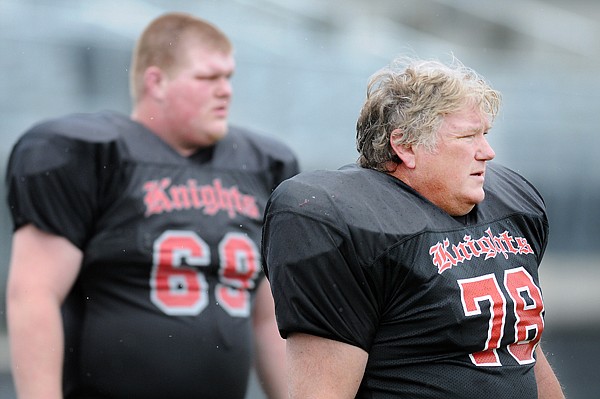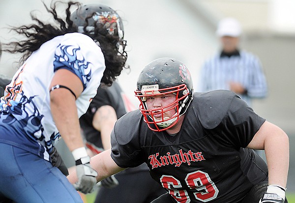 After settling in on the right side of the offensive line, it didn't take Tom long to show he could still play the game. Any thoughts that he was too old for the gridiron were thrown out during the Knights' second game against the Clark Fork Rush when Tom leveled an opposing player.