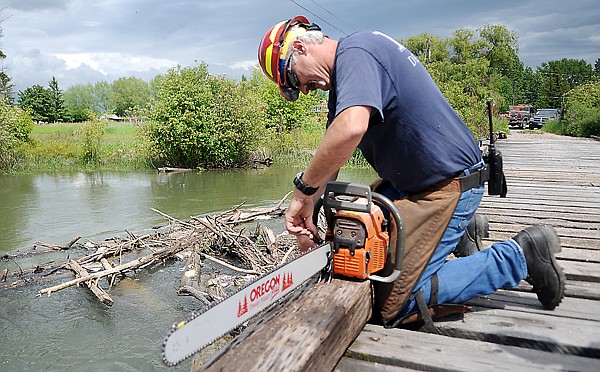 Lincoln Chute of OES prepares a saw to work on breaking up a log jam at a bridge crossing the Stillwater River on Thursday afternoon in Kalispell. The Sheriff's Department as well as the Evergreen Fire Department helped with the call.
