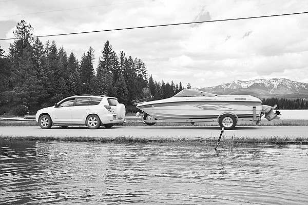 A Toyota pulls a boat across the causeway at Echo Lake Friday afternoon. Rising water has caused the lake to reach the edge of the causeway.