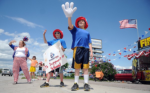 From right, Michael Foot, 11, Daniel Johnson, 10 and Janice Foot, all of Kalispell, wave to passing vehicles trying to draw customers to their TNT Fireworks stand on Wednesday afternoon on Highway 93 directly across from Murdoch's. The stand is a fundraiser for the Helena Flats School. According to Janice Foot they are happy with the response so far and are considering making this an annual fundraiser.