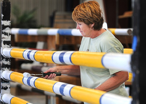 Cathy Rasch, a show jumping steward repaints poles that will be used in the show jumping courses at The Event which begins on July 21.