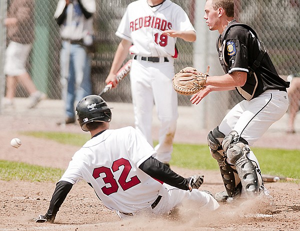 Calgary Redbirds baserunner scores a run after beating a throw home in the top of the sixth inning Thursday afternoon at Memorial Park.